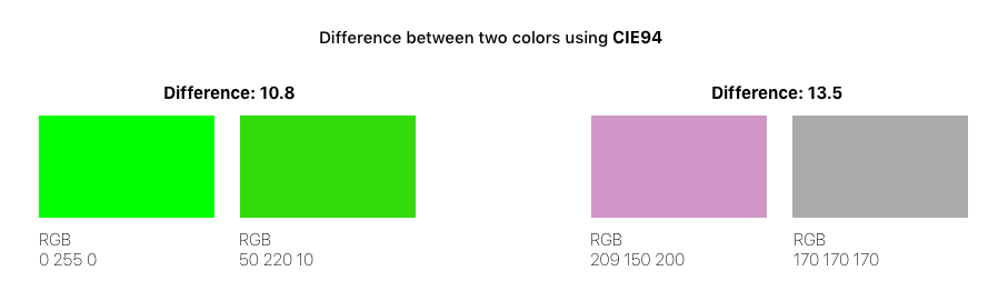 As you can see, the difference between the two greens (left) is considered greater than the difference between the pink and gray colors (right). In other words, the pink and gray are considered to look more similar than the two greens by the algorithm.
