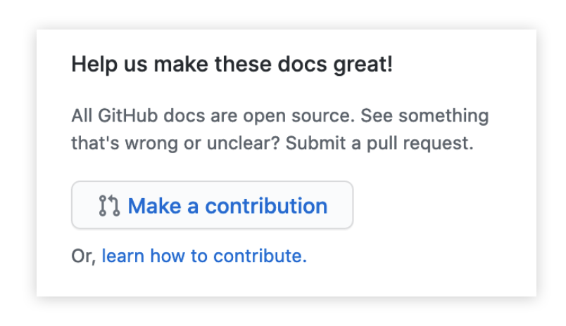 As you're using GitHub Docs, you may find something in an article that you'd like to add to, update, or change. Click on make a contribution to navigate directly to that article in the codebase, so that you can begin making your contribution.