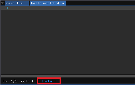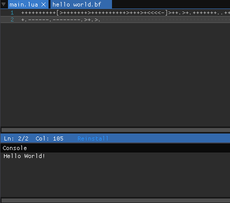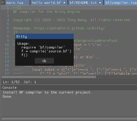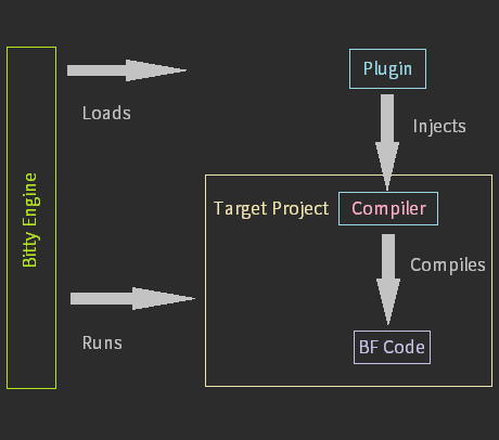 Bitty Engine loads plugin to extend its features once it's installed. It loads a BF compiler in this example which can inject the compiler to a target project. And the injected compiler/transpiler runs as regular Bitty code that translates BF code to runnable Lua chunk.