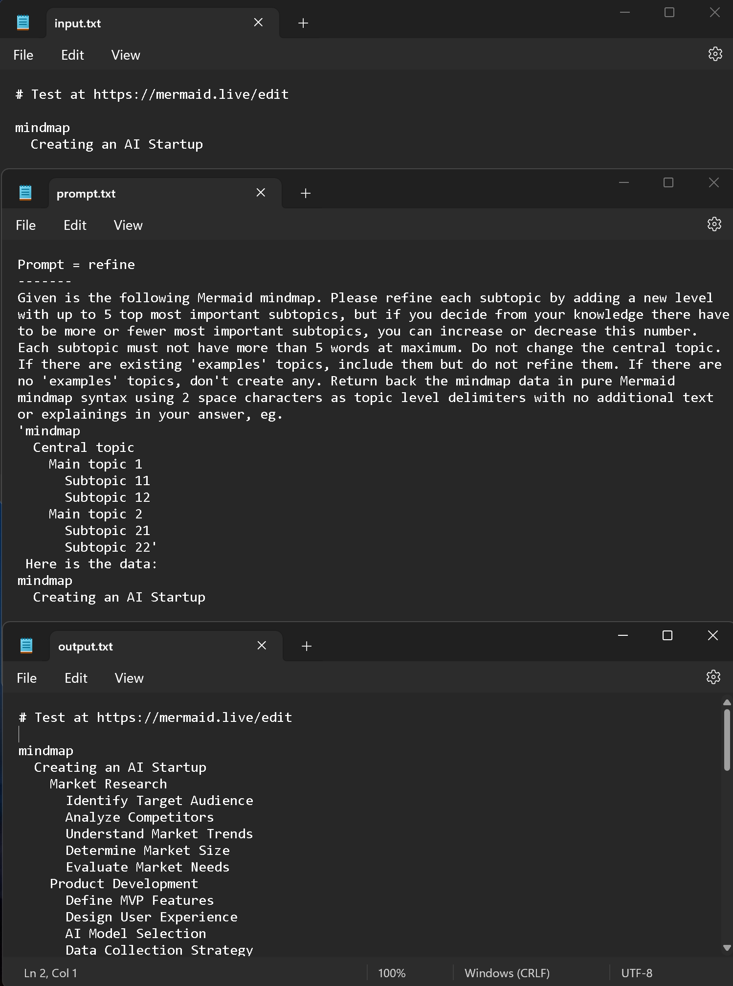 The Mermaid mindmap syntax is used when talking to the OpenAI LLM as an intermediate "language". Log file contents for input, output, prompt can be used in other use cases eg. mindmap visualizations in GitHub markdown files.