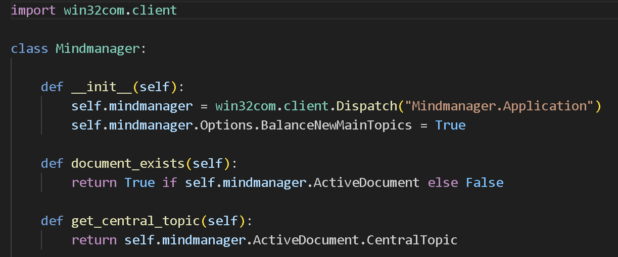 MindManager COM objects are addressed by using the PyWin32 library: