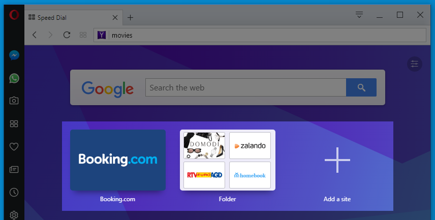 The Speed Dial is a visual set of entries made from your most visited sites or installed extensions. Speed Dial entries appear as thumbnails that link to the page. You can organize your favorite sites into folders.