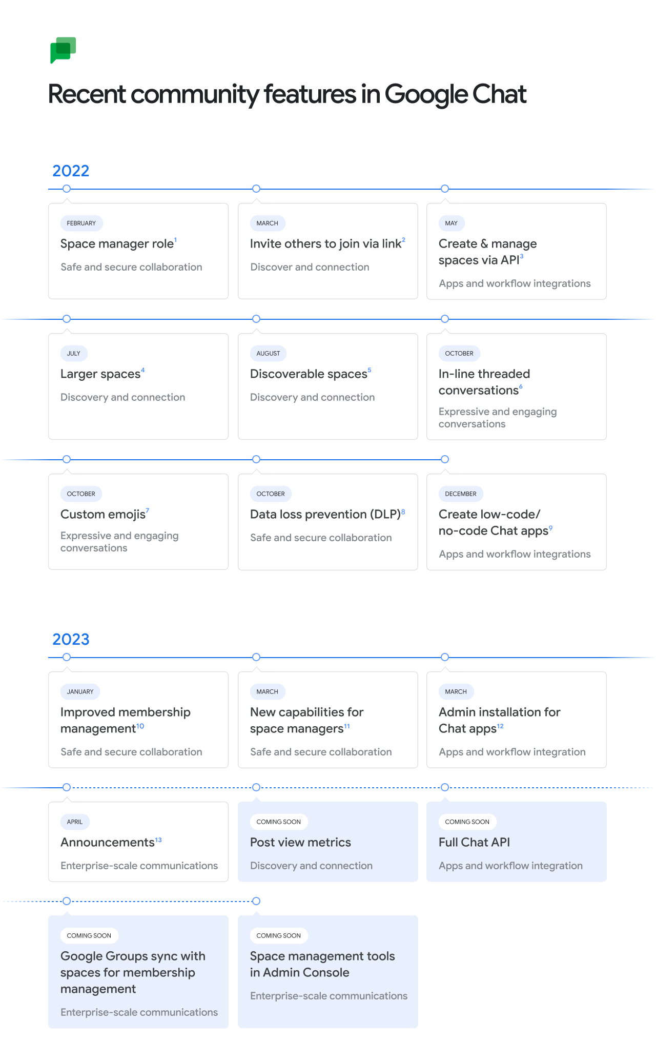 Although we are saying goodbye to Currents, we continue to invest in new features for Google Chat, so teams can connect and collaborate with a shared sense of belonging. Over the last year, we've delivered features designed to support community engagement at scale, and will continue to deliver more. Here is a summary of the features with additional details below: