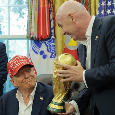 Fifa’s president, Gianni Infantino, is widely expected to award Donald Trump the inaugural FIFA Peace Prize on Friday, at the draw for the 2026 World Cup in Washington DC. The prize has led to scrutiny over Infantino’s close relationship with Trump, along with concerns that Trump might move matches from host cities and fears over visa delays or refusals for travelling fans and officials. We speak to Dan Roan, the BBC’s sports editor, about why Infantino is cosying up to Trump, and what it means for football and global diplomacy. Producer: Sam Chantarasak and Aron Keller Sound engineer: Travis Evans Senior news editor: China Collins (Image: Fifa President Gianni Infantino shows US President Donald Trump the World Cup Trophy in the Oval Office. Credit: Chip Somodevilla/Getty Images)