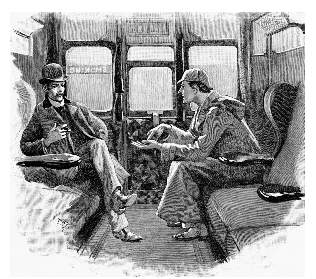 All the costumes are 1890s. I researched the train carriage, in fact this panel here is a reference to a Sidney Paget illustration from The Strand Magazine. It’s from “Silver Blaze”, one of the Sherlock Holmes short stories, you can see him and Watson sitting in a train compartment, facing each other.
