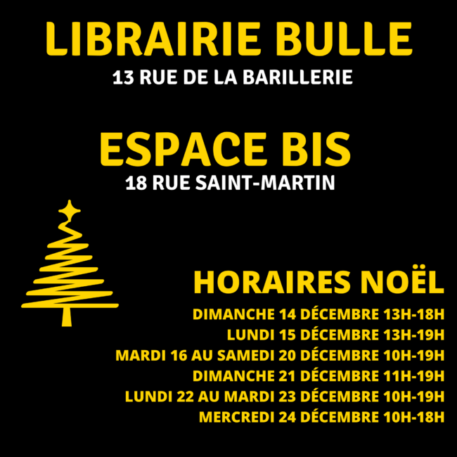 Vendredi, Rencontre à 18h30, Espace Bis – Samedi, Dédicace de 10h à 12h30 et de 14h à 16h, Espace Bis