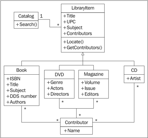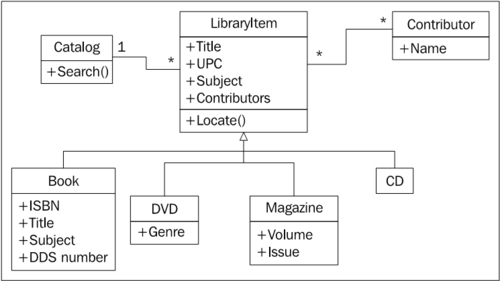 With no previous object-oriented design experience, we might consider adding separate lists of DVDs, CDs, magazines, and books to our catalog, and search each one in turn. The trouble is, except for certain extended attributes, and identifying the physical location of the item, these items all behave in much the same. This is a job for inheritance! We quickly update our UML diagram: